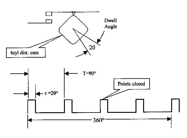 This diagram illustrates the reasoning behind the concept that a dwell meter can be used to measure duty cycle, and that the duty cycle is equal to 1.1 times the dwell angle.