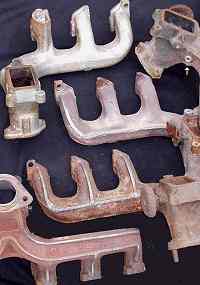All SL6 exhaust manifolds are basically the same and will interchange with all SL6 engines from 1960-86. There were some minor changes made to the exhaust manifolds over the years which added more reinforcement ribs and changed the choke stove pocket design. The first SL6 exhaust manifolds had no external ribbing and as a result, these crack and break easily. From these first manifold castings, this long cast iron exhaust manifold would prove to be a challenge to keep in one piece. As a result, the engineers added reinforcement ribs in an attempt to prevent cracking. Two external ribs were added in 1963 to stiffen the body of the manifold. 1970 added another bottom rib and ribs running up each runner "leg" . along with a revised (round) heat riser valve counterweight. By 1980 a thick section was added to the heat riser area's rear wall and this "boss" was drilled and tapped for an O2 sensor.