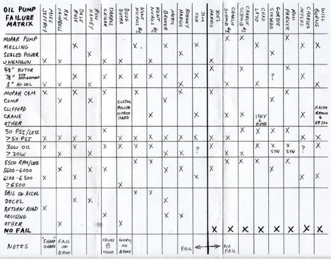 To arrive at these conclusions, we first gathered data from many racers with a questionnaire and interviews. We used data from both failed engines and those without failure. This was put into a "failure matrix" shown on the following page (apologies for typos). We were looking for a common thread through the matrix, which might show a particular pump being suspect, or a certain condition that was common. At first the results seemed inconclusive, but our later findings showed it made a lot more sense if we looked for combinations of factors.