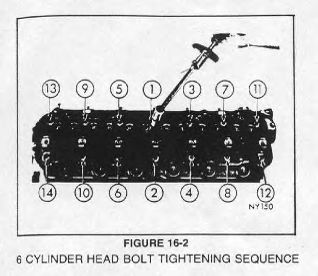 The chrome alloy cast iron cylinder head (Figure 16-1) is held in place by 14 bolts. Spark plugs are located at the wide edge of the combustion chambers and aluminum spark plug tubes serve as spark plug gaskets. Install cylinder head bolts. Starting at top center, tighten all cylinder head bolts to 50 foot-pounds in sequence (Figure 16-2). Repeat the procedure, retightening all cylinder head bolts to 65 foot-pounds.