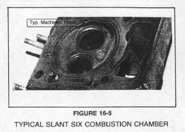 The outside edges of the 6 cylinder head's combustion chamber is machined or relieved next to the two valves as shown in Figure 16-5. If oversized valves are installed these reliefs should be enlarged.