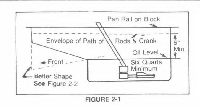 The race oil pan should be designed similar to Figure 2-2. The first item to check before building a race pan is to determine the lowest point of the connecting rod travel and the relationship of this point to the pan rail. The dimensions given in Figure 2-2 are measured from the lowest point in the rod travel not from the pan rail. This means that the pan must be made deeper than the dimension in the figure by the amount that the lowest point in the rod travel is below the pan rail or bottom of the block.