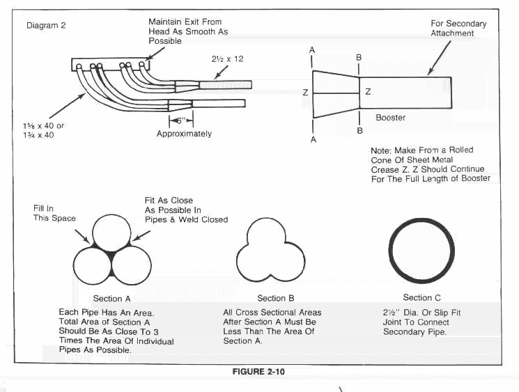 Cylinders 1-2-3 should exhaust through 1-1/8" or 1-3/4" O.D. pipes about forty inches long into a cloverleaf collector and then through a 2-1/2" O.D. outlet pipe much like current V-8 Super Stock practice. Cylinders 3-4-5 should have a duplicate system. See Figure 2-10.
