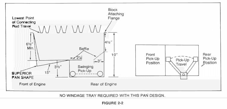 The two baffles shown in Figure 2-2 should be sealed on the three sides next to the actual pan sides. No oil should be able to pass between the baffle and the sides of the pan or the effectiveness of the baffle is greatly reduced. The swinging pickup is available from Milodon in Van Nuys, California. The oil sump should be designed so that the swinging pickup can swing to the rear of the pan on acceleration and to the front of the pan on deceleration. The pickup should stop within 1/2" of the back and front of the pan sump.