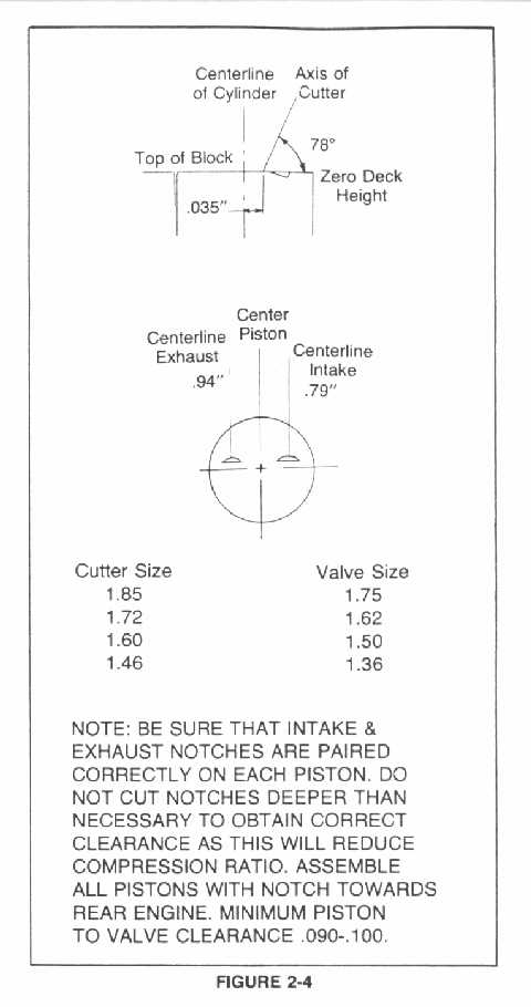 In many cases when large, long duration and/or high lift camshafts are installed in stock engines, a notch in the piston is required. The proper location for these notches is shown in Figure 2-4. As a general rule camshafts in the 225 of 290 degree duration and longer will require a notch. The '72-77 low compression engines aren't as critical as the earlier 170, 198 engines. This holds true only as long as the heads have not been milled or the block decked. Clearances in the 170 are also much closer and camshafts bigger than stock should be checked for valve-to-piston clearance.