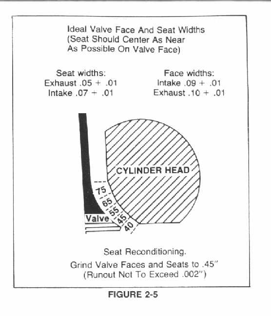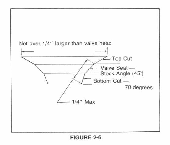 The valve must be faced at factory specification angle, and the seat angle must also meet factory specs. The valve seat may be narrowed from the top with any angle less than the seat angle, but not to exceed 1/4 inch larger than the valve head (see diagram). The maximum width for valve seat and bottom cut may not exceed 1/4 inch when measured together (top of seat to bottom of cut). See Figure 2-6.