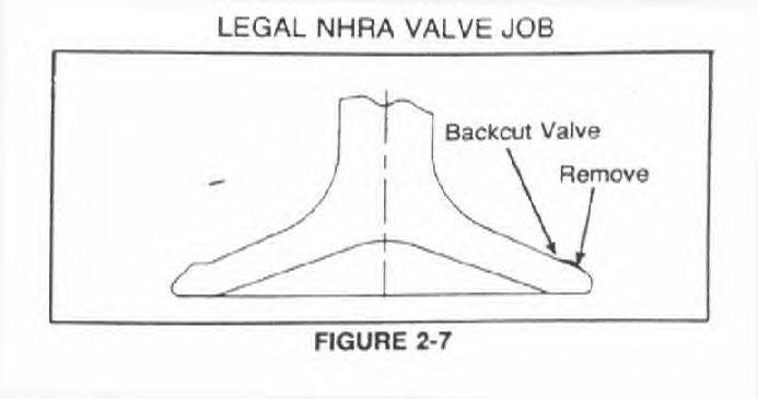 In class racing (SS/A, F/S, B/SM etc.) there are very specific rules regarding valve work and seat modifications. In bracket racing, however, there are no rules regarding valve grinding. Therefore, we can have a special "bracket valve job", sometimes referred to as a competition valve job. The valve part is relatively easy. Production wedge valves have a small ski-jump on their backside just below the seat itself. The "backcut" removes this (see Figure 2-7).