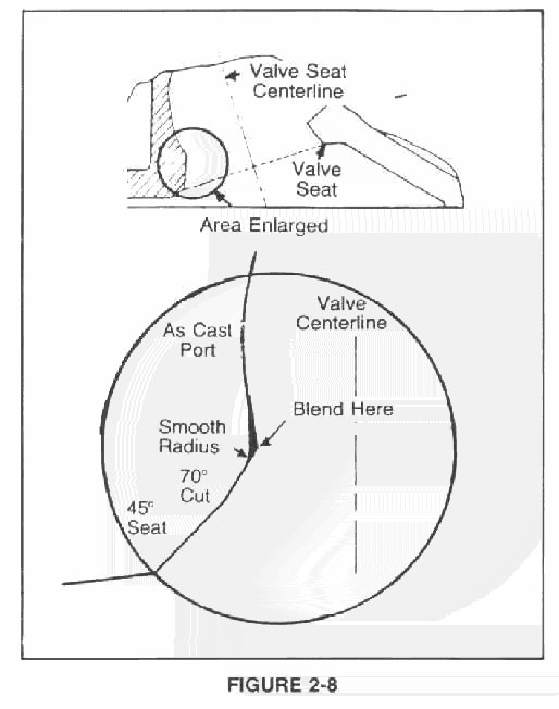 Modification of the valve seat in the head is not as easy to explain. The valve seat itself is 45 degrees, standard. The throat or approach angle is 70 degrees, but sometimes 65 degrees is used because the orbital grinder used to grind the seats occasionally will "chatter" at 70. relatively speaking, the 70 degree cut in the throat removes a lot of material, which leaves a sharp edge at the bottom 70 degree machine cut as it transfers to the "as cast" port. (See Figure 2-8).
