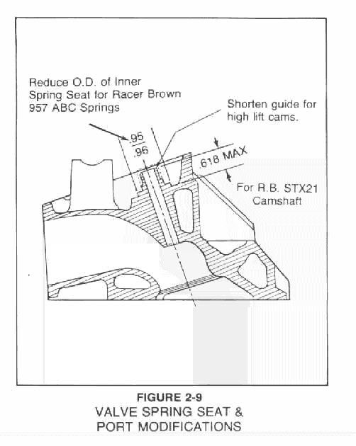 To install the dual valve spring PN P3412068, or P3614542 or other race type valve springs, the inner spring seat needs to be narrowed and also its height of the guide needs to be cut down. See Figure 2-9 for details. It is also recommended that for the high lift cams, such as the Super Stock roller cams, that the stock valve guide height be shortened by .100". For Super Stock and fully modified drag race only engines, valve seals are not used but the valve guide clearance is decreased to .001" on both intake and exhaust valves.