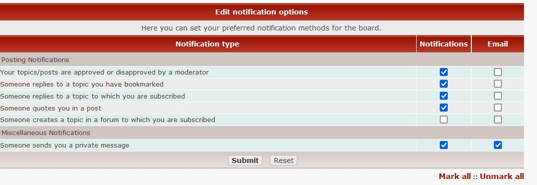 It is here that you select which categories you want Notifications and/or Email to be sent to.