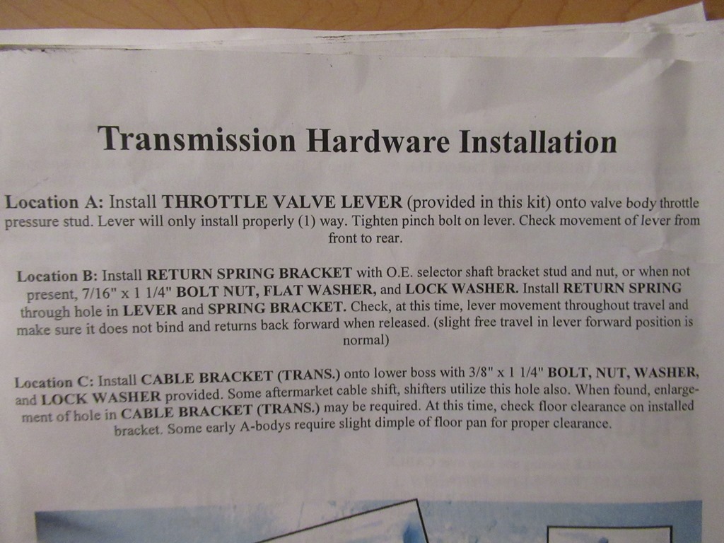 I have a 1965 Dart with a 225 and a single barrel carb. I am going to a Super Six 2 barrel intake manifold with a Stromberg 2 barrel. I have been reading the directions from Bouchillon on the kick down kit that I purchased. The directions are good and have good pictures. But I am a little confused on the transmission brackets. (See attachment). If anyone has installed this kick down kit please feel free to share any input/direction. I know that I am going to need to fabricate at the carb for attaching the kick down. I have hung a Lokar gas peddle and am going to use the Lokar cable.
