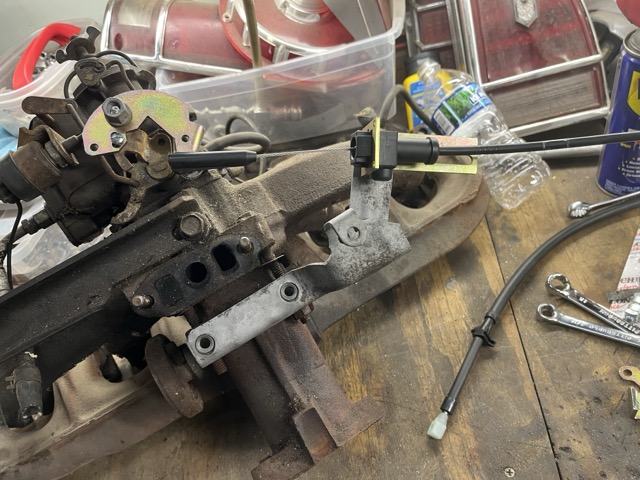 Here's a mock-up so far--looks like the carb bracket has to be cut and the kickdown cable bracket has to be mounted on the outside of the stock 2 bbl accelerator bracket with the accelerator cable moving to the inside.