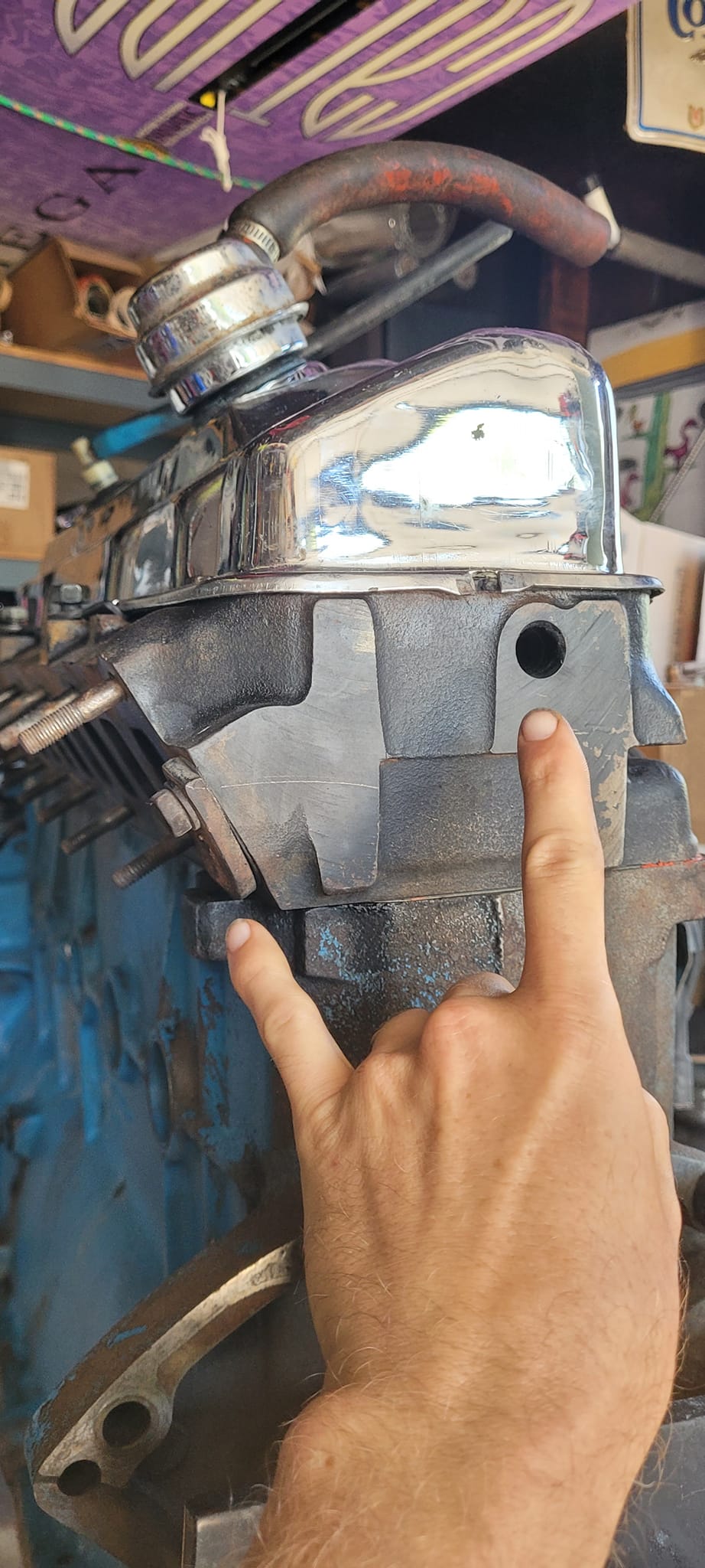 That's not MY pinky, I just grabbed that picture for reference. I know the hole by the pinky in the picture is the air injection port. What I am wondering about is the hole bytheindex finger. I have never seen a gole on the back of the head like that. I am wondering what it is for. It doesn't appear to line up witha passage needed to bore out the air injection passage, and it looks like it goes directly into the water jacket. That is why I am thinking it is a marine appliation head because the cooling systems on marine engines were a bit diferent. But that is pure speculation on my part. I don't actually own the head in tha picture, but it is the second head I have seen online this month that has that hole. The other head i saw had a big pipe plug in that hole.