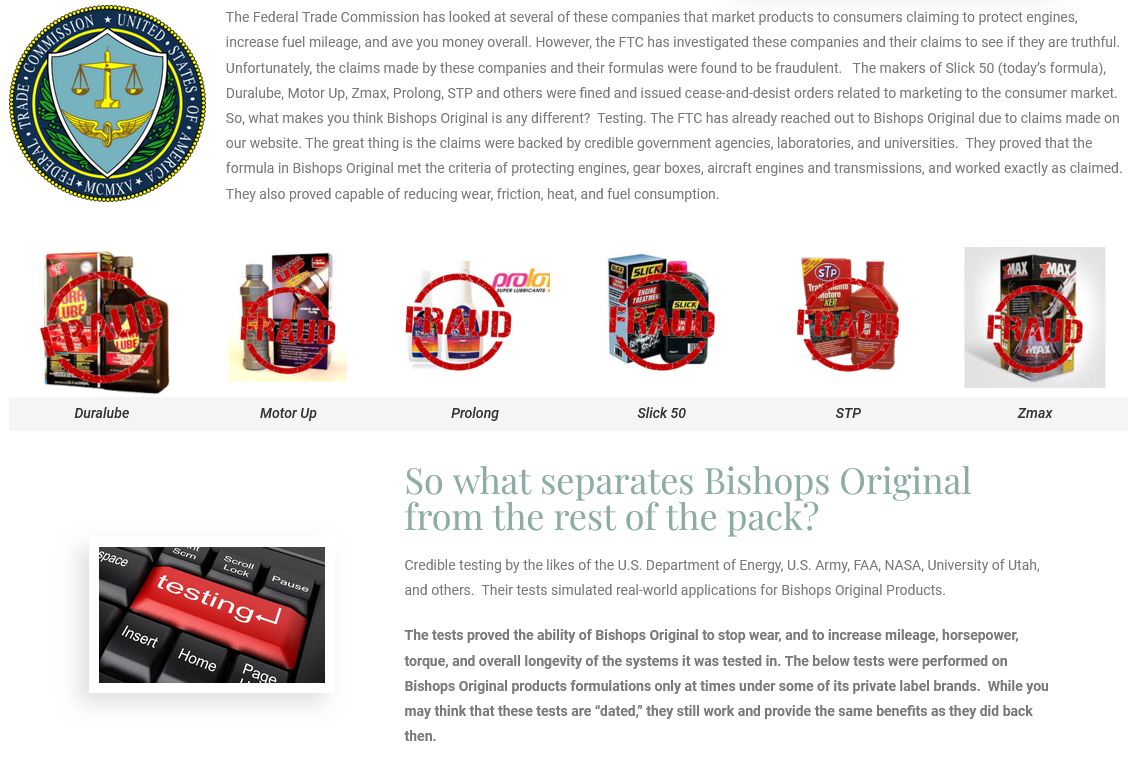 You might want to do more research regarding the history of Bishop's products and his patented formula which was part of the original "slick 50" oil treatment before Bishop and slick 50 parted ways and he went with his own company.