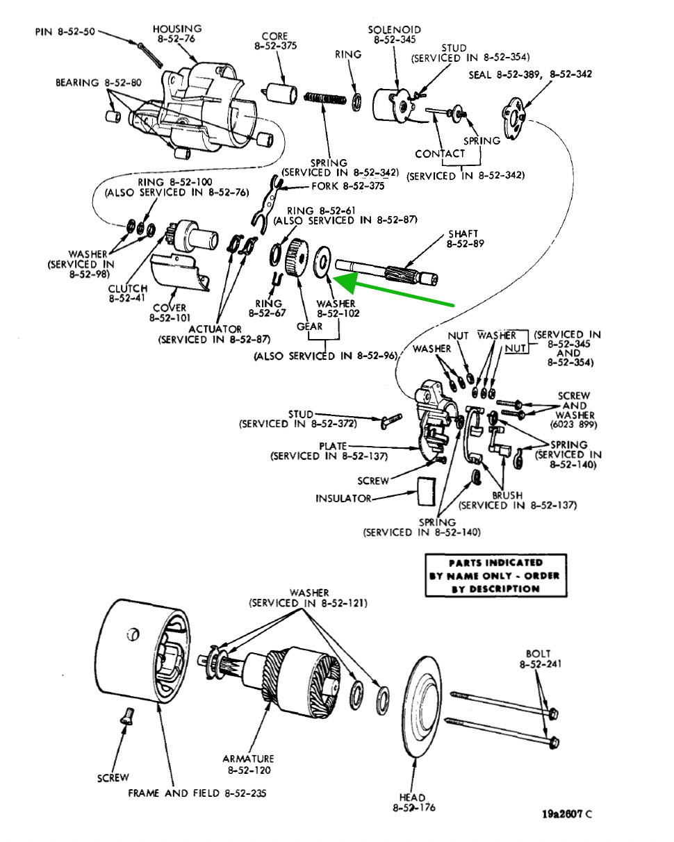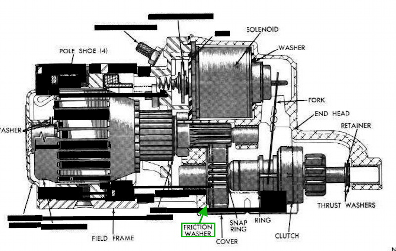 "Brake washer" or "friction washer" under the driven (larger) gear in the gear case. Gotta be there, and thick enough to do its job, or there'll be problems: excessive spindown time, too much end play in the driven gear shaft (--->excessive wear at both ends of the shaft), etc. They're available in leather or fibre, in a range of thicknesses to account for gear case wear (or erosion by abrasive cleaning methods). see the array of brake washers for the Chrysler starter here.