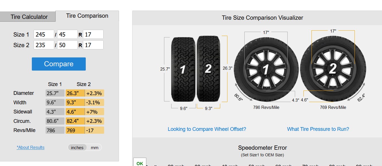 235/50R17 (26.25") on a base 2005 Nissan 350Z.