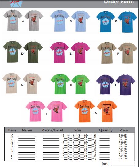 I touched up the order forms by adding the color names under the shirts. On the Long sleeve shirts the darker green (C) on the form is actually the black shirt. There is no dark green shirt.