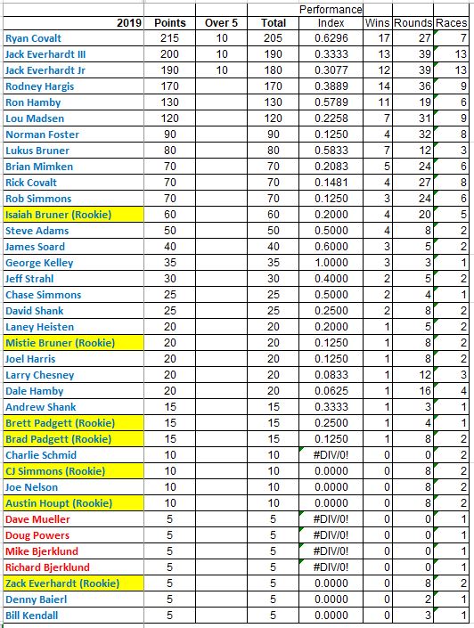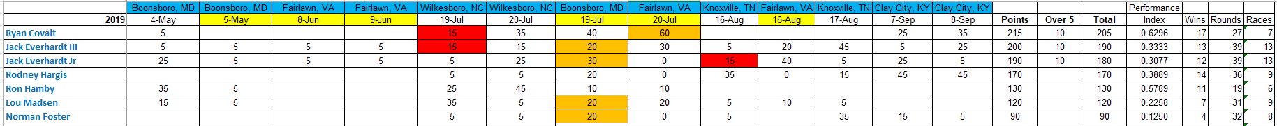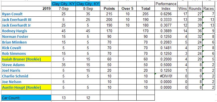 Here is a Snip of the overall points for the Top 7 racers coming out of the Clay City race and setting the stage for the Mason-Dixon Brawl next month.