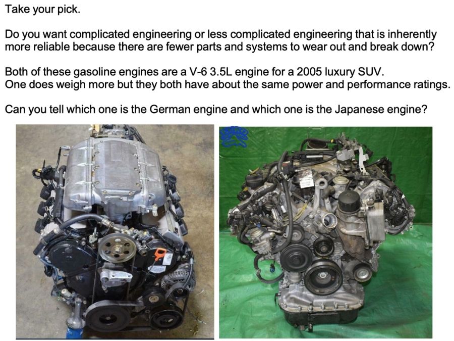 • What exactly are we to pretend to have learnt about dependability, durability, or any other aspect of two engines by looking at pictures of them?