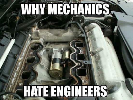• Modern starter motors last a long time. The starters themselves are better and more durable than they've ever been, and their job is easier than it's ever been; modern fuel-injected engines with modern oils start immediately every time, without any extended cranking. So the starter replacement job shown in this meme might happen once, but more likely zero times, in the life of a vehicle equipped with this engine.