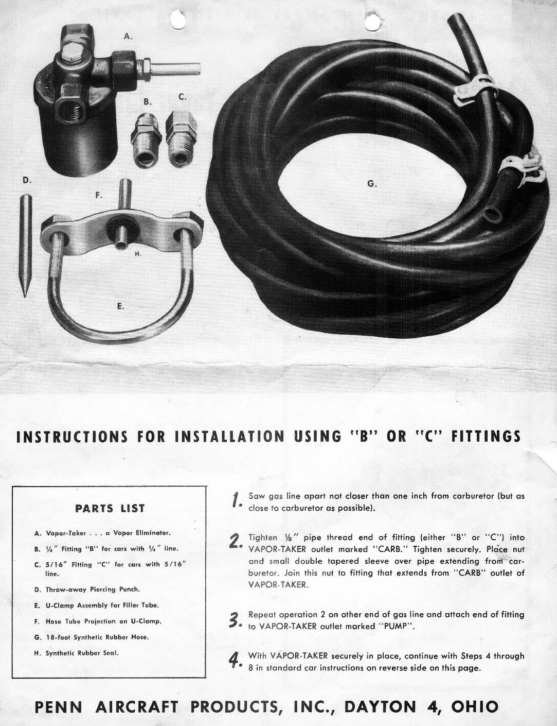 …there was this attachment you could buy. These instructions have a manufacturer address with a postal zone, and those were replaced by ZIP codes in 1963, so that plus the mid-'50s car profile gives some idea of the era. Looks like a close ancestor of the 3-nipple fuel filter used in the Ultimate Xtreme Stage-2 version of the fuel line mod: a chamber for vapour to be separated from liquid fuel, and provisions to send the vapour back to the fuel tank. My best guess is that inside the can, the inlet from the fuel pump is near the top and the output to the carb is at the bottom, and there's a small orifice—maybe 0.045" or so, like the one in the 3-nipple fuel filter—in the vapour outlet. The saddle clamp for the fuel filler pipe reminds me of the quick-'n'-dirty ones used to tap into a cold water line for an icemaker or whole-house humidifier, or the puncture-type side taps for cans of refrigerant. I learned of this item from a blurb about the 1973 AMC police cars; its mention made me go looking and I found the instruction sheet. Don't know that the kit used by AMC was the same as the older kit in the instruction sheet, but seems plasusible.