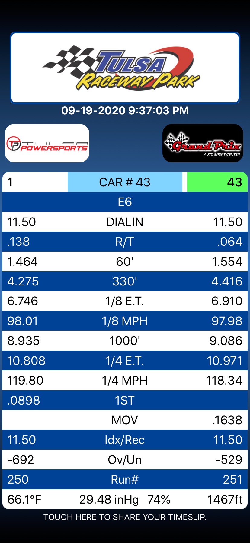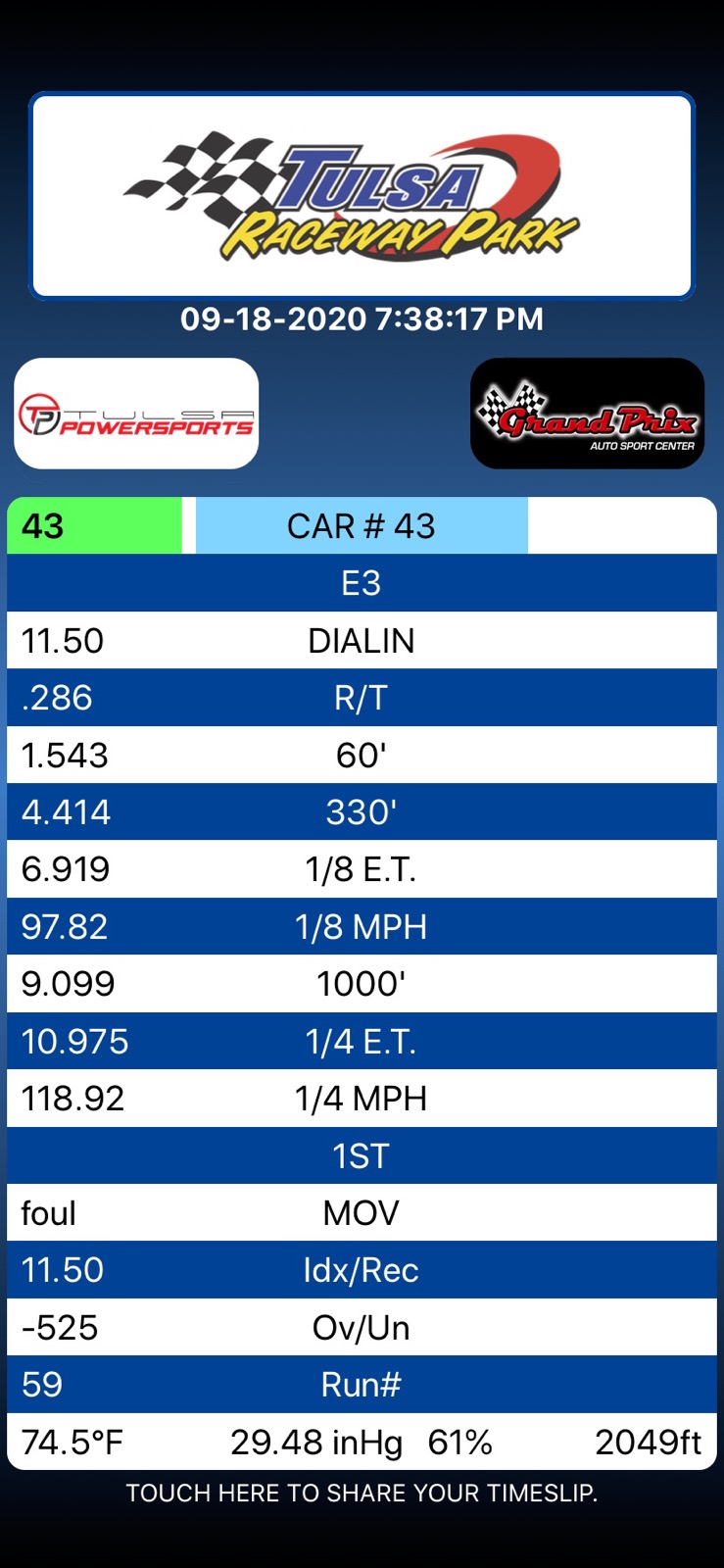 11.02 @ 120.56 Shaker223, 1.57 60', Turbo/FMIC, 1970 Swinger, 2.76 gear, 255/60/15 radials, 3300lbs Race Wt. Sept 2010