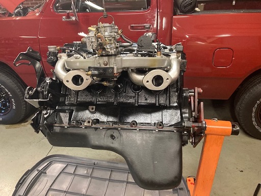 The engine is about buttoned up, oil pan on the bottom and the cylinder head back on top.