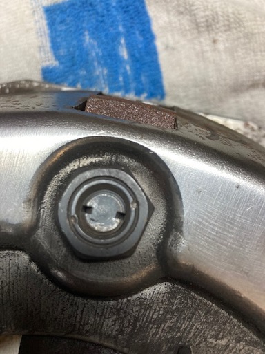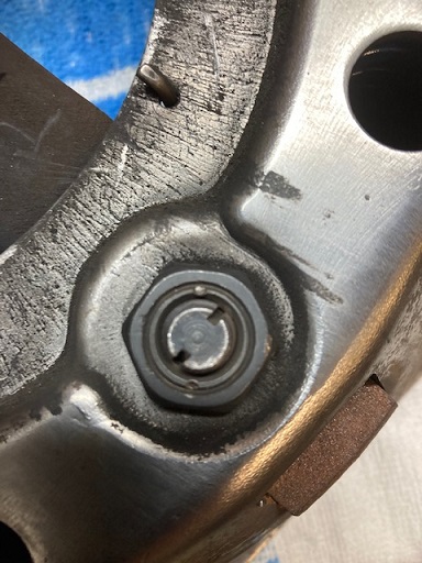 The other two photos are of the adjusting bolts on the pressure plate that is being removed. With that pressure plate bolted up to the flywheel there is nearly 1/4 inch height difference between the three clutch plate fingers where they would touch on the TOB. A closer look at the adjusting bolts, shows that the staking that was to hold the adjusting bolts in place was too light to be effective. The stake mark did not intersect into the threads of the bolt.