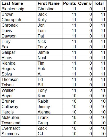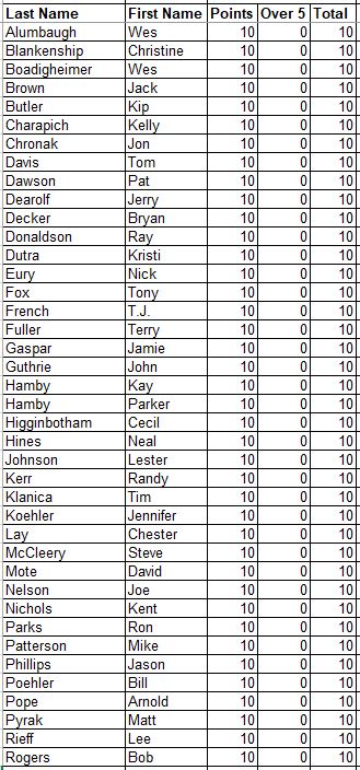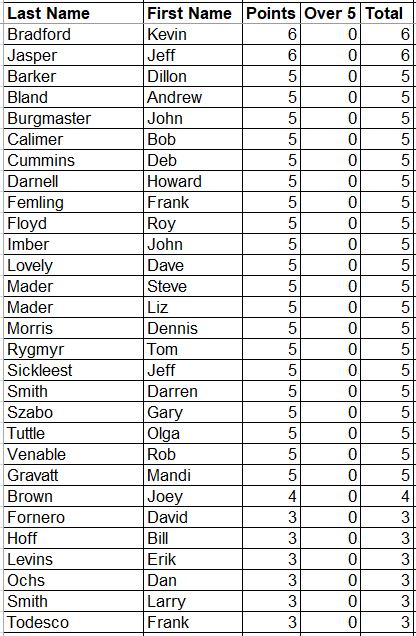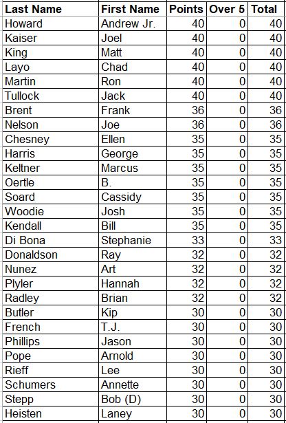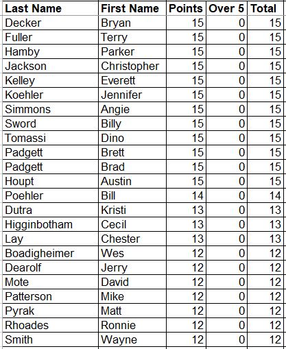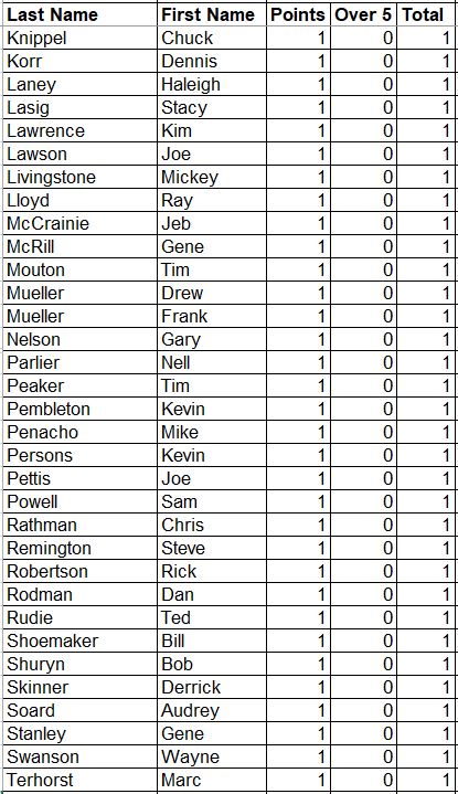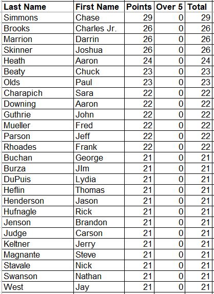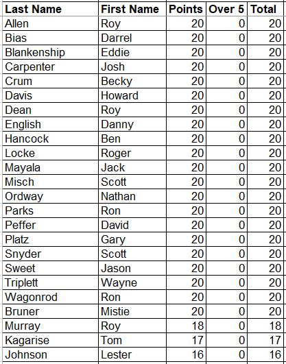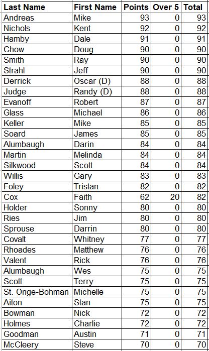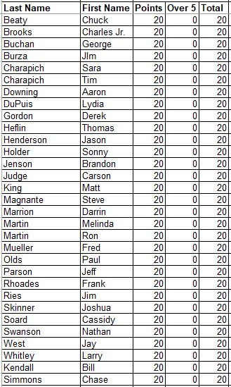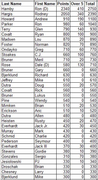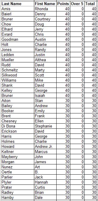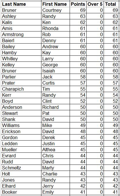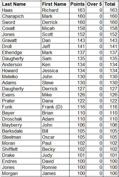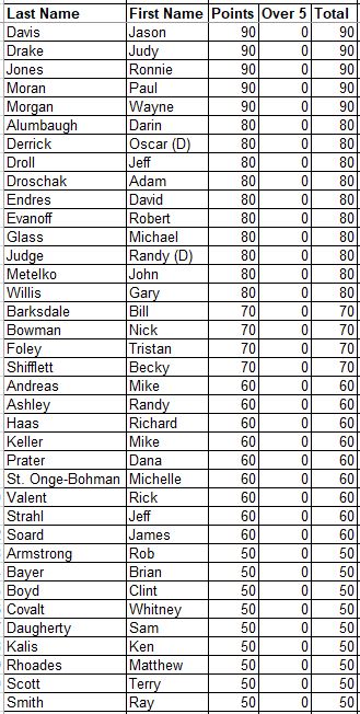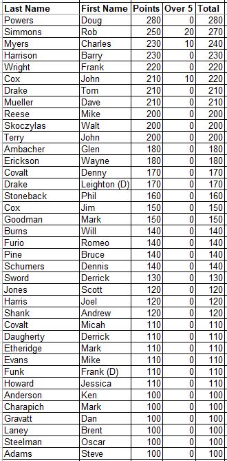 Here are the updated Career Points for everyone. This is every point earned since the beginning with all attendance and record points added.