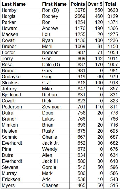 This next list shows the career totals for everyone showing Round Win points only. It does not include any attendance points or the 20 bonus points for setting records.