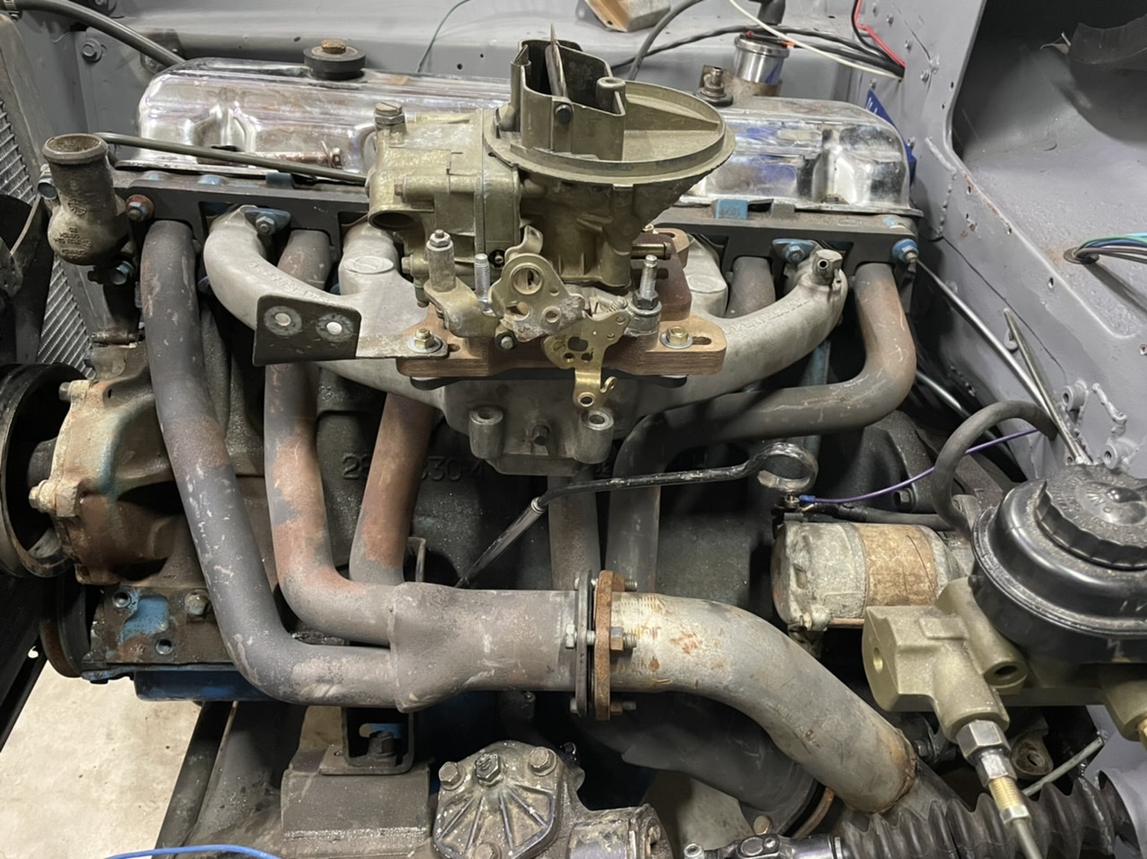 That transmission cooler is all plumbed now, along with the 500 CFM carb on the Offy manifold. Shorty headers and dual exhaust finish that up.