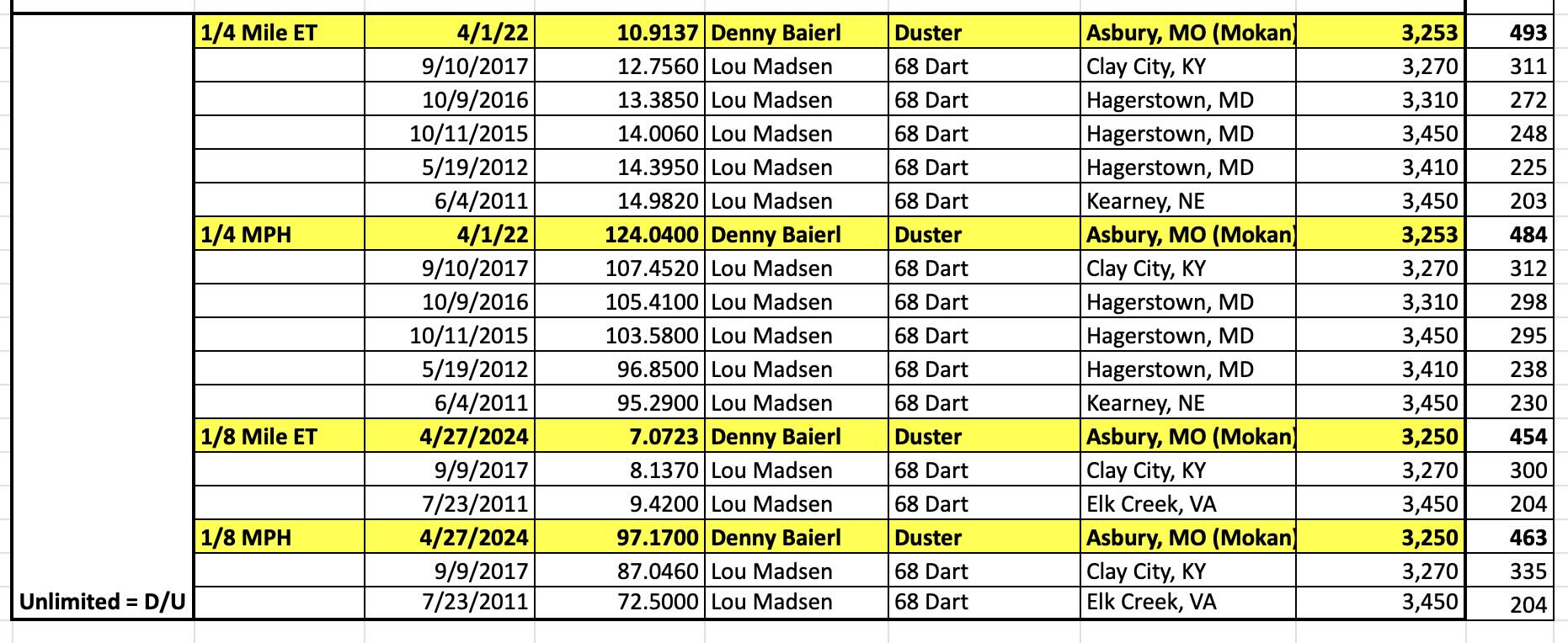 Here is the official 1/8 D unlimited record set by Denny Baierl at Mokan in April.