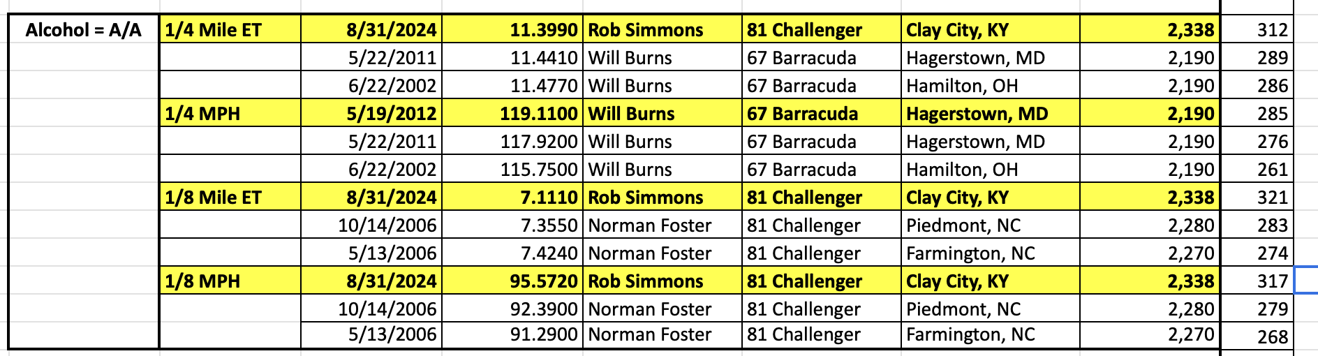 Check out the new records Rob set at Clay City last month! Huge congratulations to Rob on getting the challenger running great and setting some national records in both the 1/8 mile and the 1/4 mile in the A/A Class!