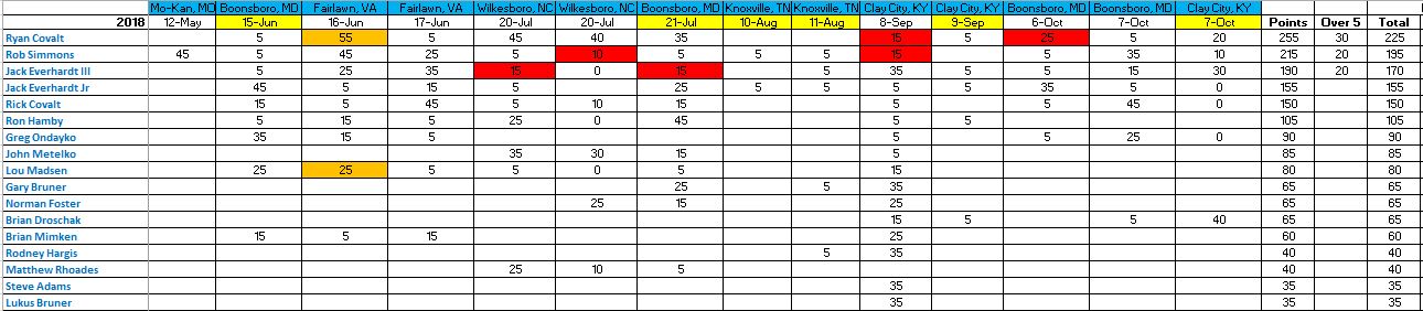 Rounding out the Top 5 is Rick Covalt with 150 points. Rick did well at Mason-Dixon and plans to come to Knoxville hoping to climb back up the ladder and see his son, Ryan, win the Championship.
