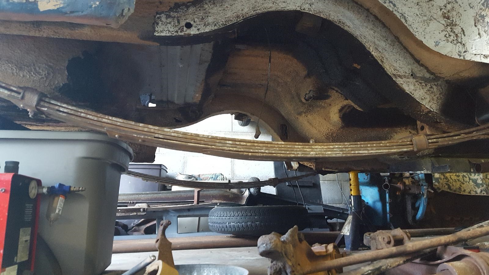 Joe went back over and added more leaves to the leaf spring pack to stiffen it up. He also got the front suspension mostly reinstalled with thicker .920 torsion bars. Just need a few cotter pins here and there and the shocks to have it ready to be on all four (LBP) wheels again. He also put fresh oil in (again) and put some Marvel Mystery Oil in the cylinders. The carb on it now is beyond saving, so we will put another 1 barrel on it to get it started and diagnose the engine before trying to upgrade anything.