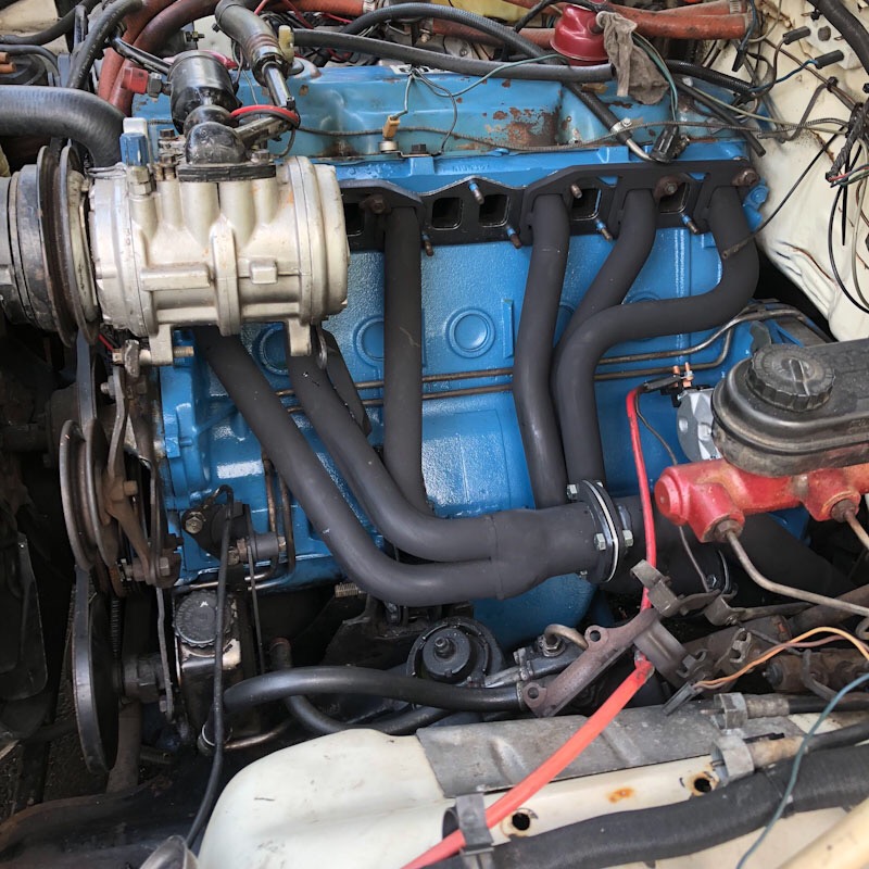 Update on this project (or, What I Did on My Summer Vacation): Clifford shorties are installed; while I had that side of the engine available, I cleaned it up and gave it a new coat of blue paint. I got a 2-1/8 diameter kit from Speedway, got all the pipes cut, welded up and hung up. At the stock location near the trans mount, I fabbed up a longer bracket to hold both sides of the pipe then built a mirror image of the stock hanger to fit in the driver side. Painted the intake, used a Remflex gasket, created a bracket for the choke. And new motor mounts plus a “mini-starter”. Finally, put in tail pipes to put the exhaust out both sides behind the tires.