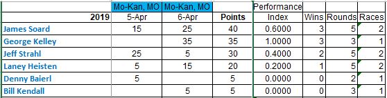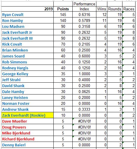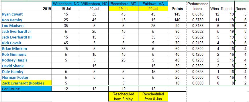 Here are the results from the four races held at Wilkesboro, NC this weekend. You can also see that Ryan has taken over the points lead with his two wins and Runner Up finishes.