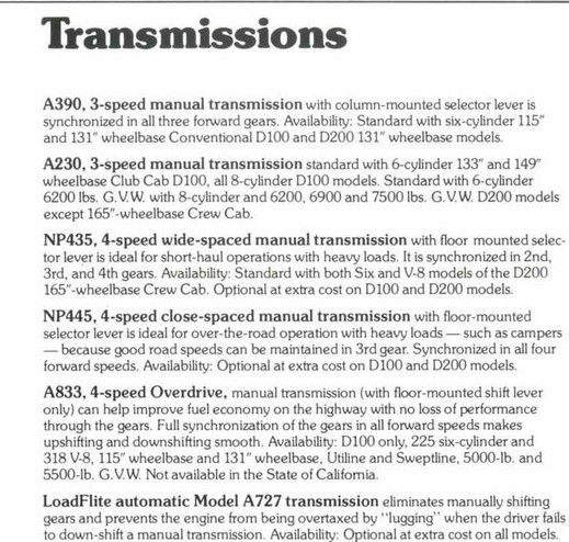 The A833/A833OD was never offered in a 4x4. You could use one with a divorced transfer case as with the 1971 and older trucks, but it would be far easier to find and mount the NP435 transmission and transfer case. The NP435 was offered in 2WD trucks so even if you can't find a slant six 4x4 you can get a trans and transfer case from a V8 truck and swap the bellhousing.