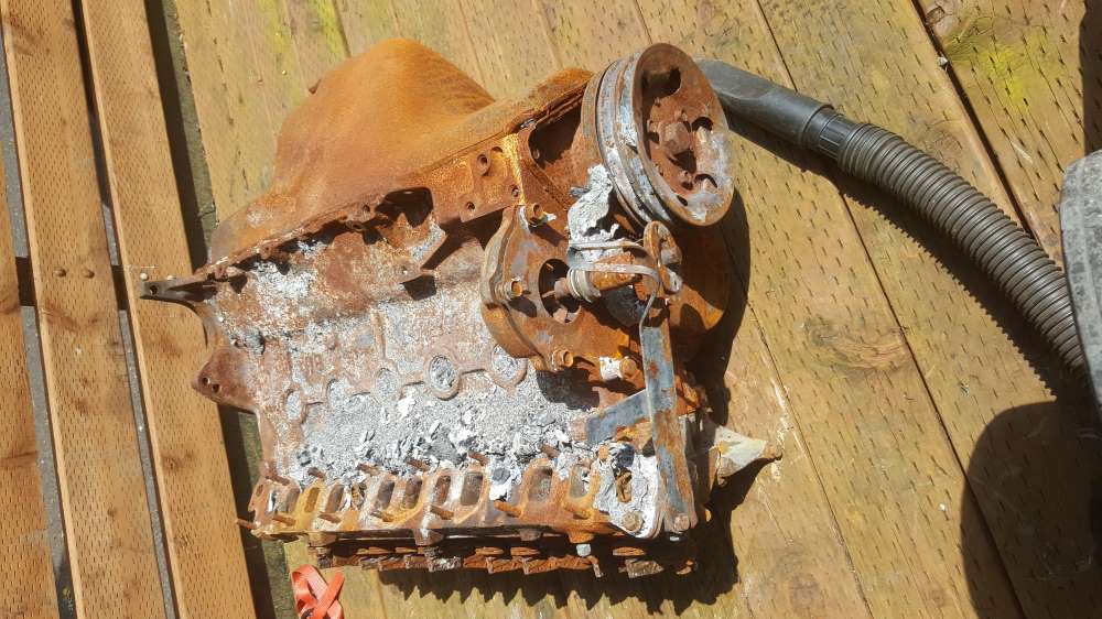 I began tear-down this afternoon. Aside from the melted aluminum this seems like marine salvage. Rust is everywhere. The '75-'76 peanut plug head is off and I got 11 of 12 valve springs and retainers off. There is one exhaust valve stuck full open and the spring coil-binds before I can get the keepers out. I also cannot get the oil pump out as it's rusty and won't turn and neither will the camshaft. The valve stems and lifters are soaking in PB Blaster. The pistons are +.040". The pistons didn't melt, but the heat treat has to be gone.