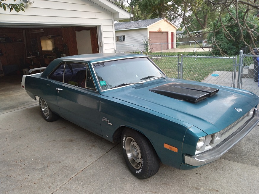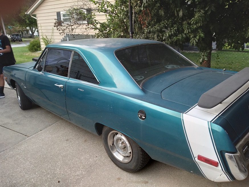 My name is Chuckster. My 14 year old grandson, Logan, recently bought a '72 Dart Swinger 2 door as a project him and I will work on so he can drive it when he turns 16. We live in central Illinois. We (grandson, my daughter, and I) drove just over 3 hours north to Marengo, IL. to look at it, bought it, and drove it home! We passed the Chrysler plant in Belvidere to get there. Only issue we had was a possibly factory spring clamp on the bypass hose rusted in two, causing an anti-freeze containment issue. Once we replaced the clamp (by bypassing the heater core to borrow a clamp) and adding water we made it home without any issues. It's a factory A/C car (but all under-hood items are missing), power steering, manual disc brakes, and someone recently converted it to Electronic Ignition. It does have some rust, but it was undercoated when new, so it doesn't appear to be too bad for a car that has lived in Illinois it's whole life!