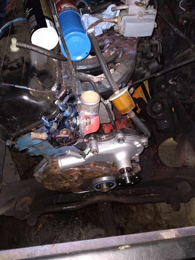 We are currently working on the mechanicals to keep it in running condition. So far we have changed both motor mounts (pass side was in 3 pieces, had a little extra lean to it...lol), removed the radiator, thermostat, and water pump to replace with new. Tomorrow we will tackle replacing the timing chain and gears (doesn't look like its ever been apart), and going to try adjusting the power steering box to try and eliminate the large amount of play in the wheel.