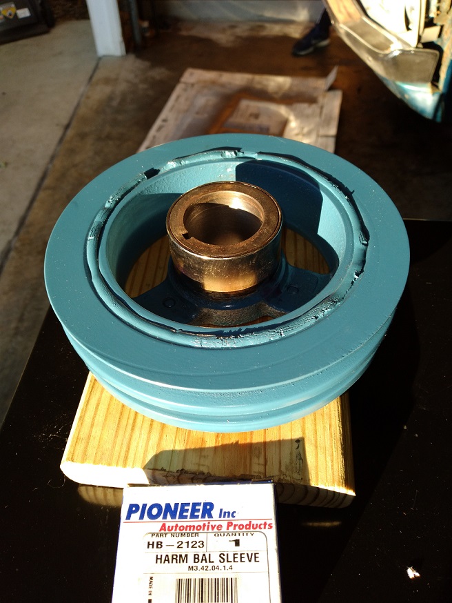 Made some good progress today, I cleaned and painted the left motor mount bracket while Logan was in school. When he got home we did a lot of cleaning and painting, installed the left motor mount bracket, installed a repair sleeve (groove in damper where seal rides) and installed the harmonic damper. A few days ago I detailed the timing mark bracket to easier see the marks.