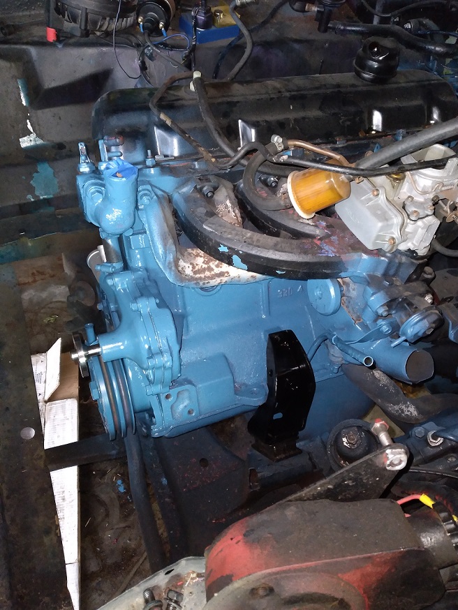 The last week, and today, we got all of the old, probably factory, gasket material from around the timing cover and water pump. That was a lot of work. Wound up using my right-angle drill with a cup brush, and it was slow going. Last Thursday we tried installing the timing cover, but couldn't get the two dowel pins through the holes in the cover. Only way I could figure out how to do it was by dropping the oil pan slightly. Friday my grandson got underneath and loosened the pan bolts about 2 turns. Had to raise the engine a little and remove the driver's side motor mount bracket to access a few of the bolts. Today we were able to drop the front of the pan just enough to seat the timing cover. Then we proceeded to install the new water pump and bypass hose (with worm-style clamps), and the new 180 degree thermostat. Hopefully tomorrow we can repaint the front of the engine Chrysler blue, along with some other areas we can get clean enough.