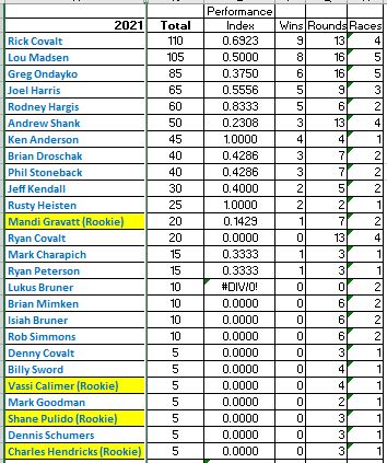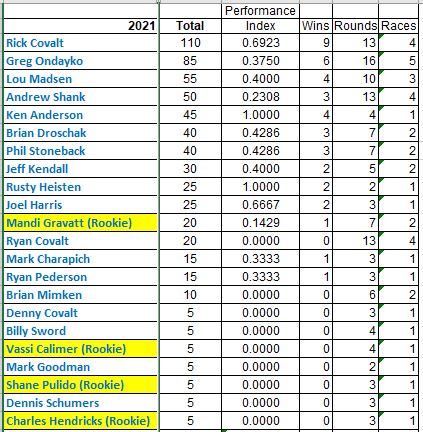 My apologies to Greg Ondayko. I forgot to add him to the "points" list I sent Rob above. I went off the ladder and since Greg broke before that he wasn't on there. Rob will add his attendance points soon.