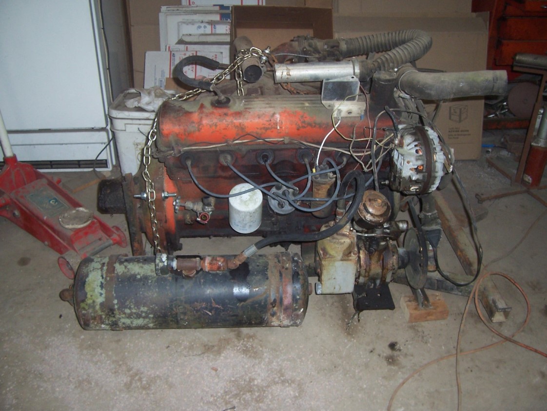 New to this forum. I recently obtained a slant six from a combine that I plan to use to run a Harvester chain saw on my log cutting machine. I ran a compression check on it today and 5 cylinders are 125 to 150 but number 1 cylinder is only showing 50 PSI so it's going to need some work. The problem is I have no idea what year it is, what displacement it is or any thing else about it. It has point ignition, 3 core plugs so I'm guessing its pretty old. Is there any way to identify it so I'll be able to get parts for it. In my younger days when I was a mechanic I worked on several of these slant sixes. Any help or info would be greatly appreciated. Here are a couple of pictures of it and my home made log cutting machine I intend to use it on. I tried to upload pictures but the upload timed out after about 5 minutes the file size is too big these are 480KB and it looks like the maximum they can be is 256 KB. I will see if there is any way to resize them.