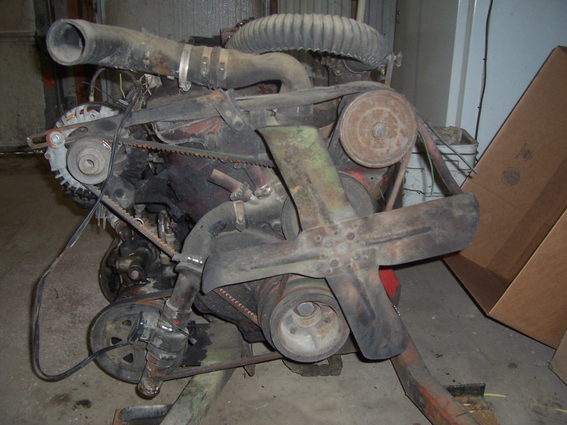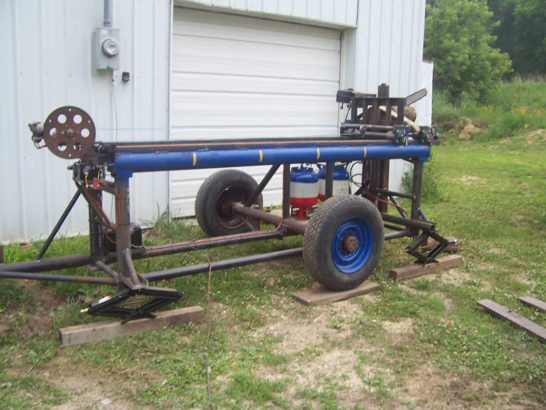 Slant six pictures. Here are a couple of pictures of the /6 these were taken when I first got it in the shop and a picture of my home built log cutting machine. My intentions are to replace the Stihl chainsaw I currently have on the cutter with the slant six mounted ahead of the axle with a drive shaft back to the new Harvester saw that I'm building with chain drive from the drive shaft to the saw. This will give me much more power, heavy .404 pitch chain and a longer bar so I can cut larger diameter or more logs at a time much faster. If you want to see details of how I built the machine you can check my thread on the Outdoor Power Equipment forum at Log cutting machine under Tree Work Equipment by Dave Sr. Thanks for the replies guys I'll probably have more questions after I decide how much of a rebuild I'm going to do on the /6.