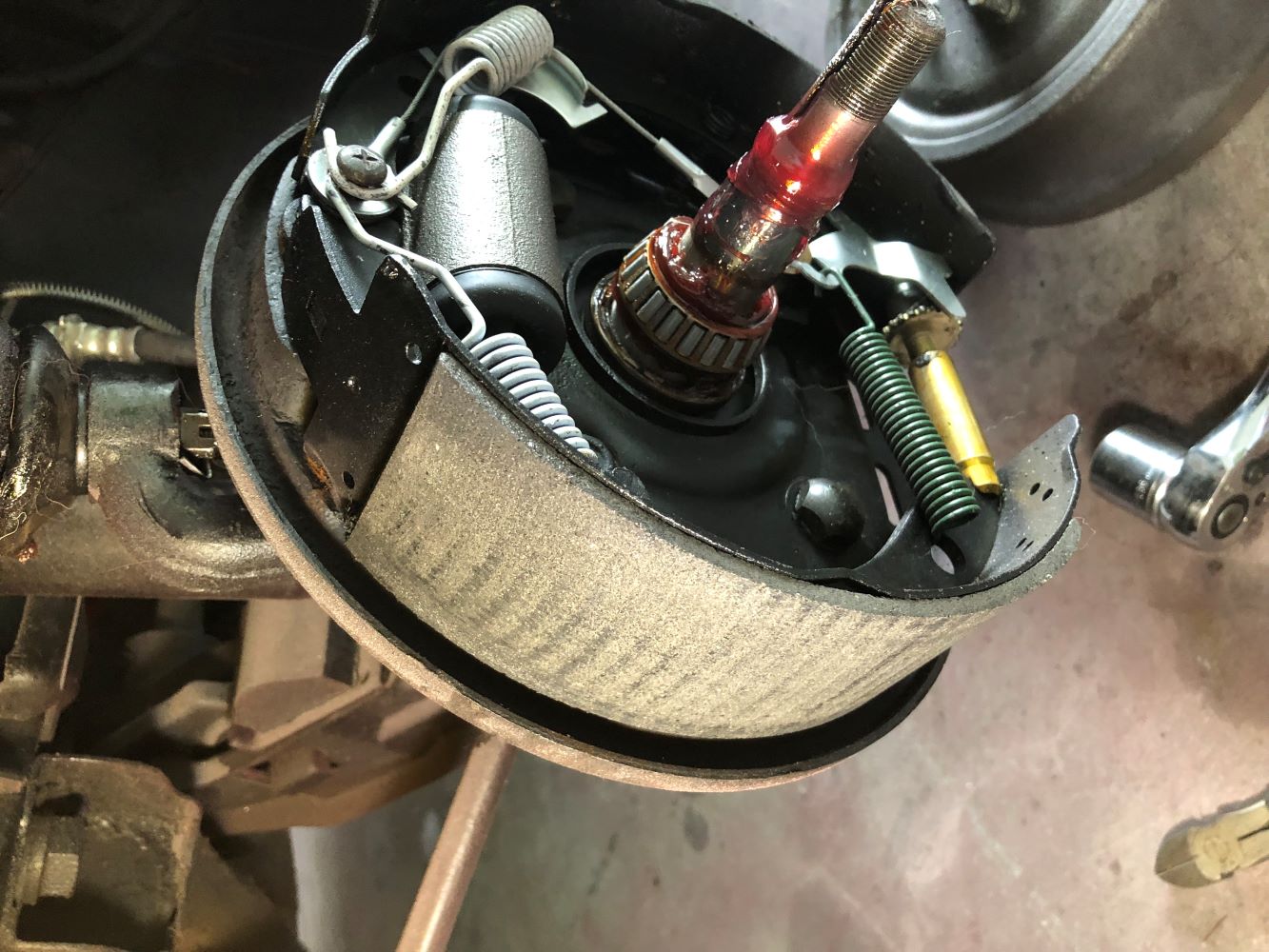 Moreover, the new shoes are "green" (haven't been really hot yet) so are still outgassing whenever they do get hot. The gas they let off acts as a cushion between the shoe and the drum, counteracting your attempt to force the two into hard contact with each other. This could have been addressed in advance by heating each brake shoe to 350° for a couple of hours (old toaster oven in a well-ventilated place, because it's gonna stink).