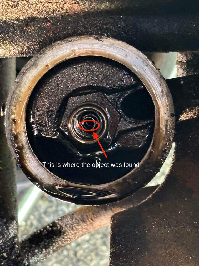 But I noticed something really weird. In the nipple that the oil filter screws, there appeared to be a piece of debris sitting on top of a spring. I thought maybe this was the source of my problem. I picked up the piece of debris, and it looked like a mechanical part. What is this thing? Do I need to put in a new oil pump? Can I do so with the engine in the car? Can I remove that spring? See photos...