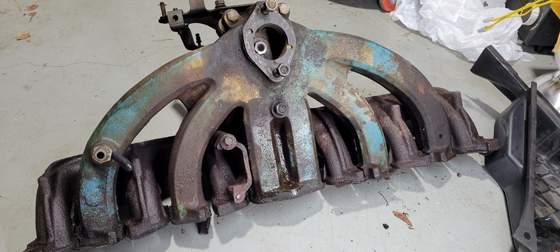 Specifically, the '70-'72 manifolds have an open "stove" (hole directly into the inside of the manifold) at the top of the № 5 runner. This is sealed (kindasorta, not very well) by a stamped sheetmetal cup that fits into the hole, with a (no longer available) gasket around its perimeter. On top of this cup is bolted the choke thermostat. If you are bound and determined to run this manifold, and there's any kind of a fault with or near the choke—doesn't work quite correctly, rod all tweaked and bent, rusty AF, exhaust leaks, etc—fabricate a blockoff plate and cut a suitable gasket for it, then plop a № 1231 electric choke kit on and be permanently done with choke problems.