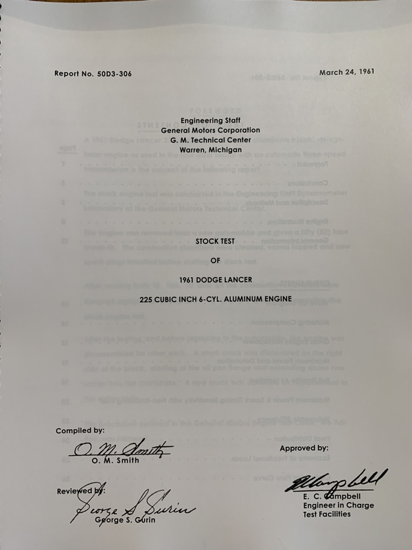 In 1961, General Motors bought a 1961 Dodge Lancer with an aluminum 225 engine. They pulled the engine, put it in one of their dyno rooms, and did a very detailed analysis of every aspect of its operation and performance. Every variable and parameter was reported, down to the formulation of the fuel used for the test runs. Power and torque, fuel consumption, exhaust backpressure, spark advance, detonation thresholds, volumetric efficiency, carburetor flow, crankcase blowby volume, friction horsepower, etc, were all carefully measured and plotted in a 36-page document. Very much more detailed and realistic information than Chrysler ever published on the subject. Once I learned of this report's existence, it took me about two decades of persistent trying to get hold of it before I finally succeeded—just in time; a few months after I finally got my paws on it, the GM technical archive was decimated. Everything older than 15 years was discarded. Not digitized, not microfilmed, not offered for sale; it was all shredded and trashed.